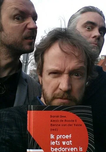 Alexis de Roode, Daniel Dee and me with our anthology ‘Ik proef iets wat bedorven is’
